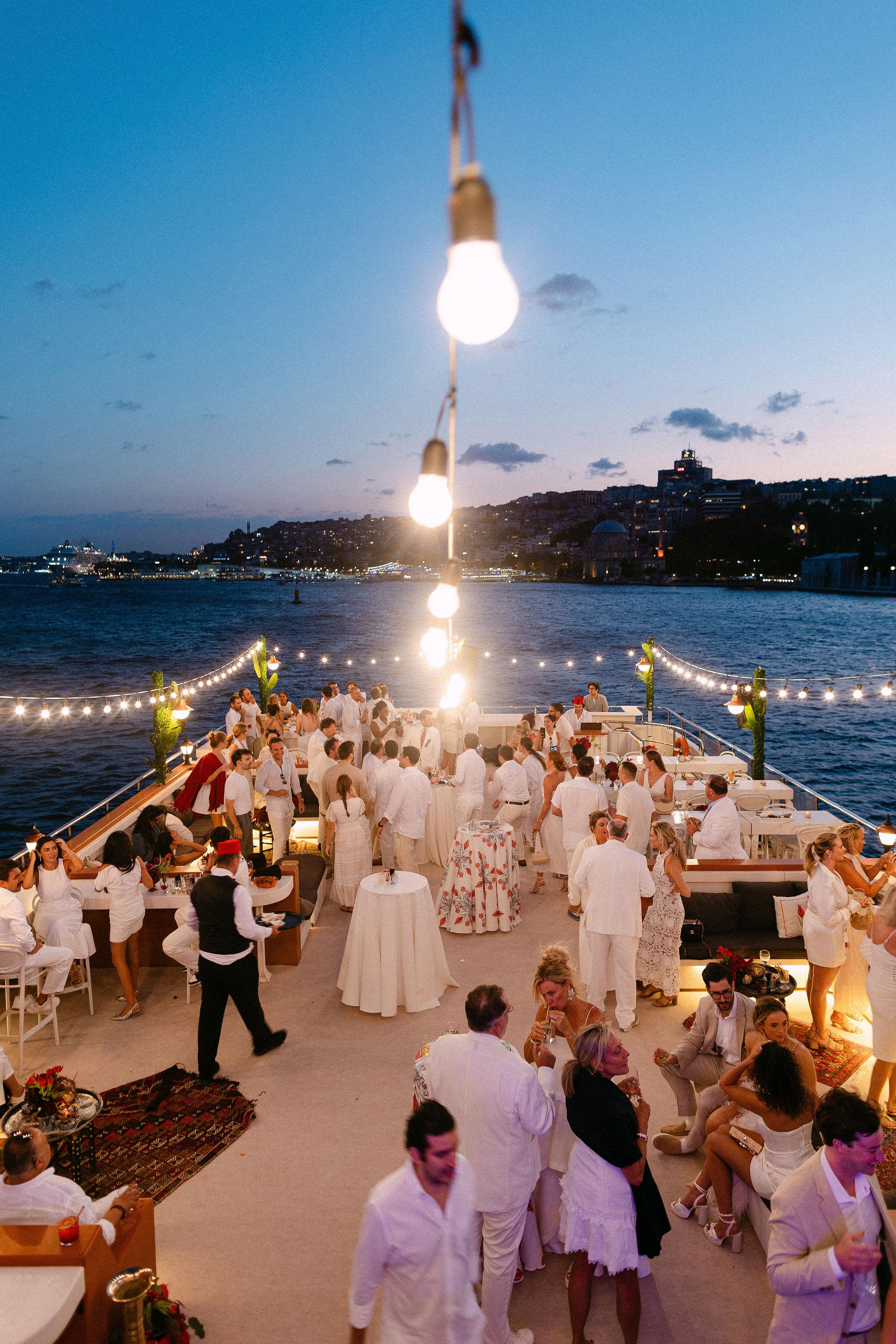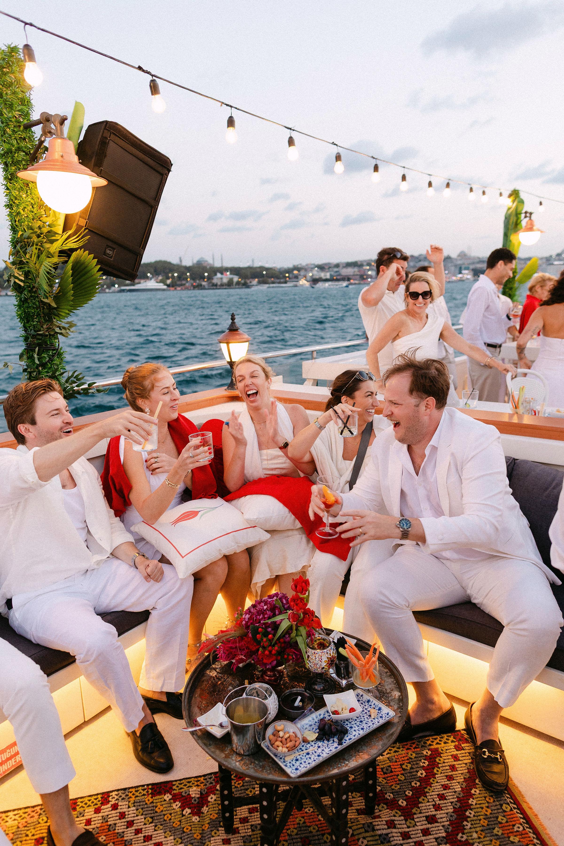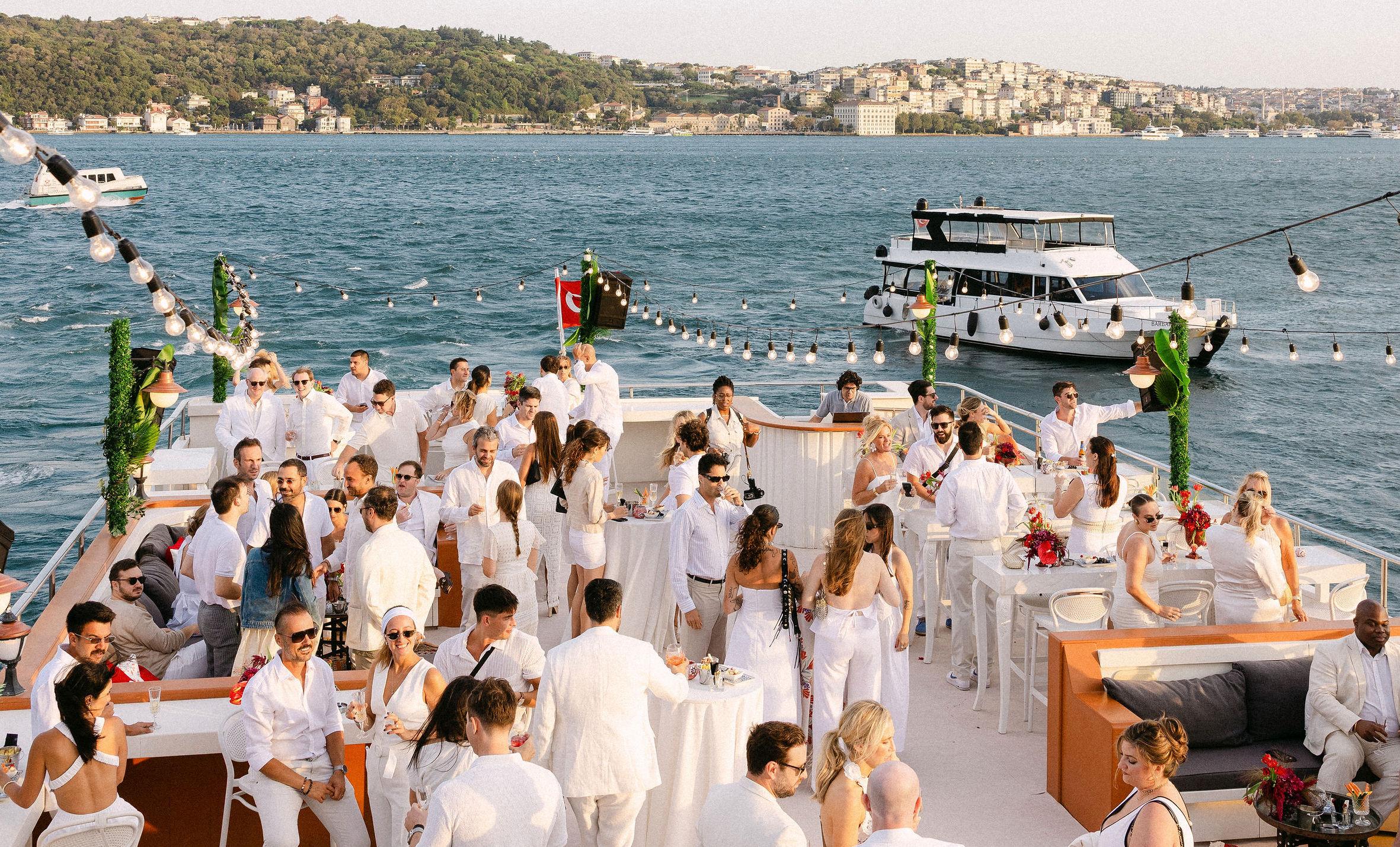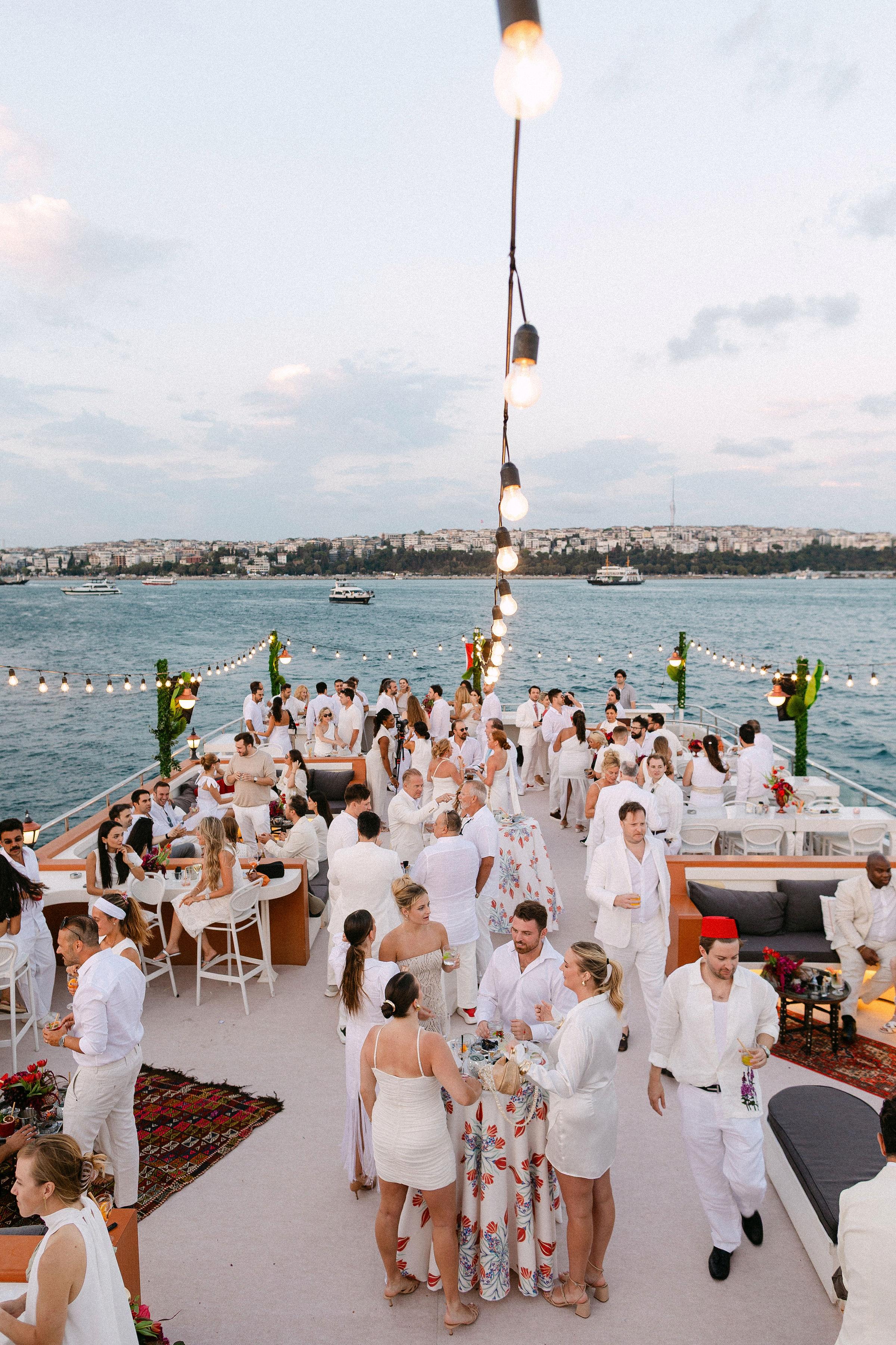 Düğün haftasının heyecanı, Çırağan Sarayı’ndan hareket eden özel bir tekne turuyla, İstanbul’un kalbinde başladı. Abbey ve Mete’nin yurt dışından gelen misafirleri için hazırladığımız bu "Welcome Party", geleneksel Türk misafirperverliğini modern lüks deneyimlerle birleştirdi ve düğün hafta sonuna misafirler harika bir etkinlikle başladılar. Teknenin zemininden dekorasyonun en küçük detayına kadar özenle uyguladığımız kırmızı beyaz konsepti, İstanbul Boğaz’ının lacivert sularıyla kusursuz bir kontrast oluşturdu. Tüm misafirlerin beyazlar içinde katıldığı gecede, sevgili Abbey, Cult Gaia tasarımı elbisesiyle İstanbul’un ışıkları altında adeta parladı. İmza kokteyller, teknede yankılanan müzikler ve İstanbul Boğaz’ının serin esintisi eşliğinde gerçekleşen bu gece; sadece bir kutlama değil, İstanbul’u bir destinasyon düğün rotası olarak seçen Abbey ve Mete ile misafirler için unutulmaz bir deneyime dönüştü.