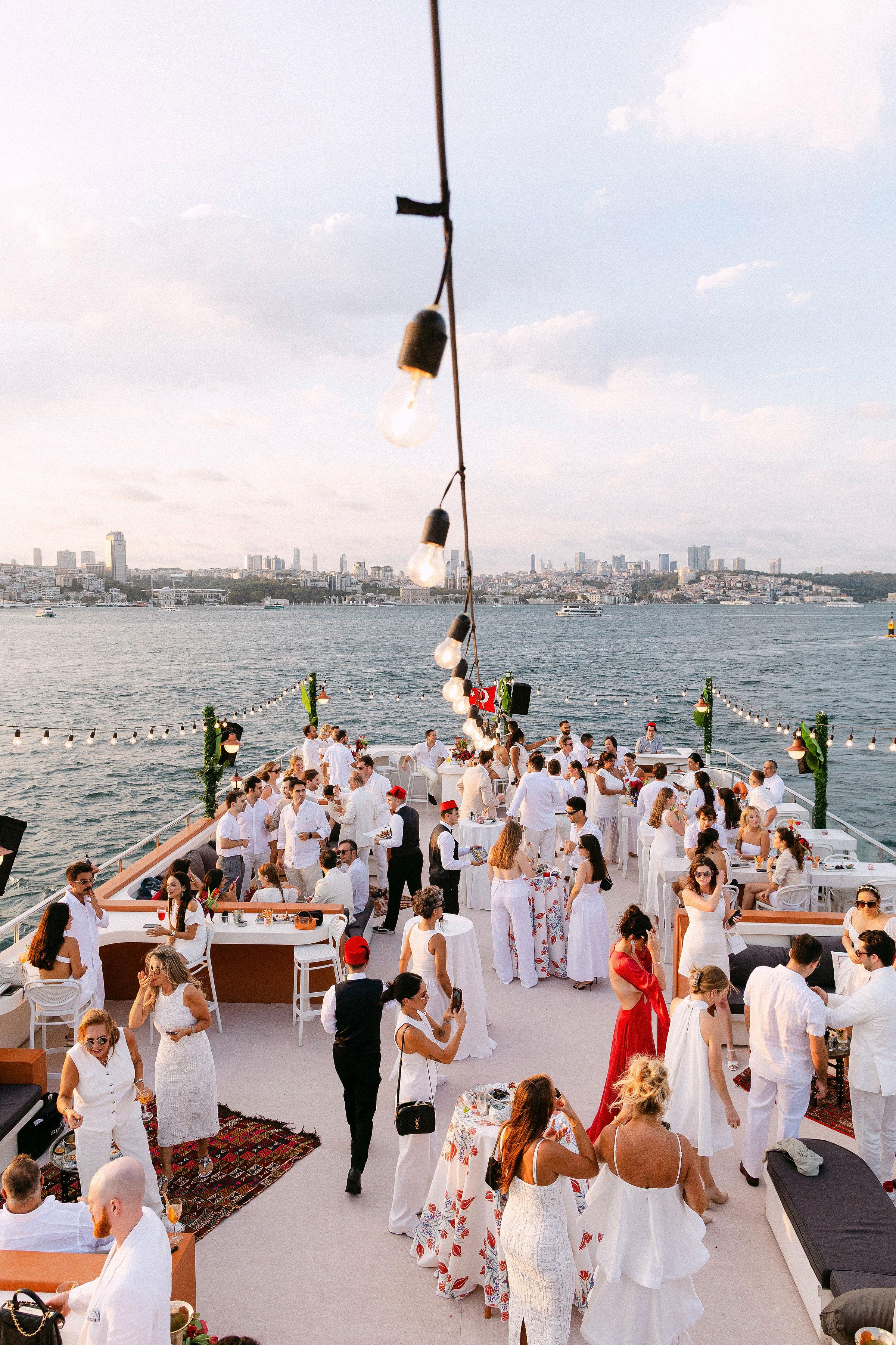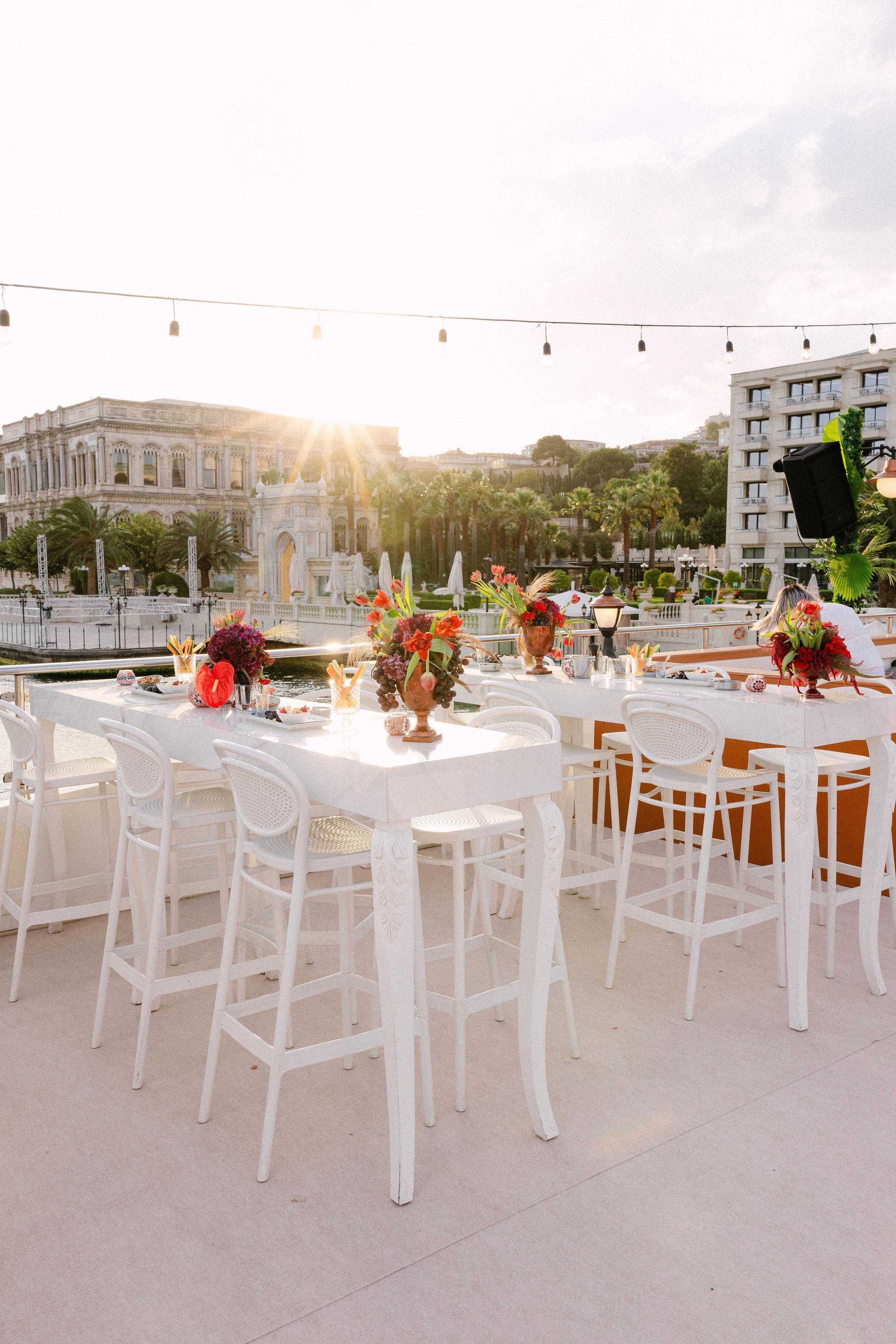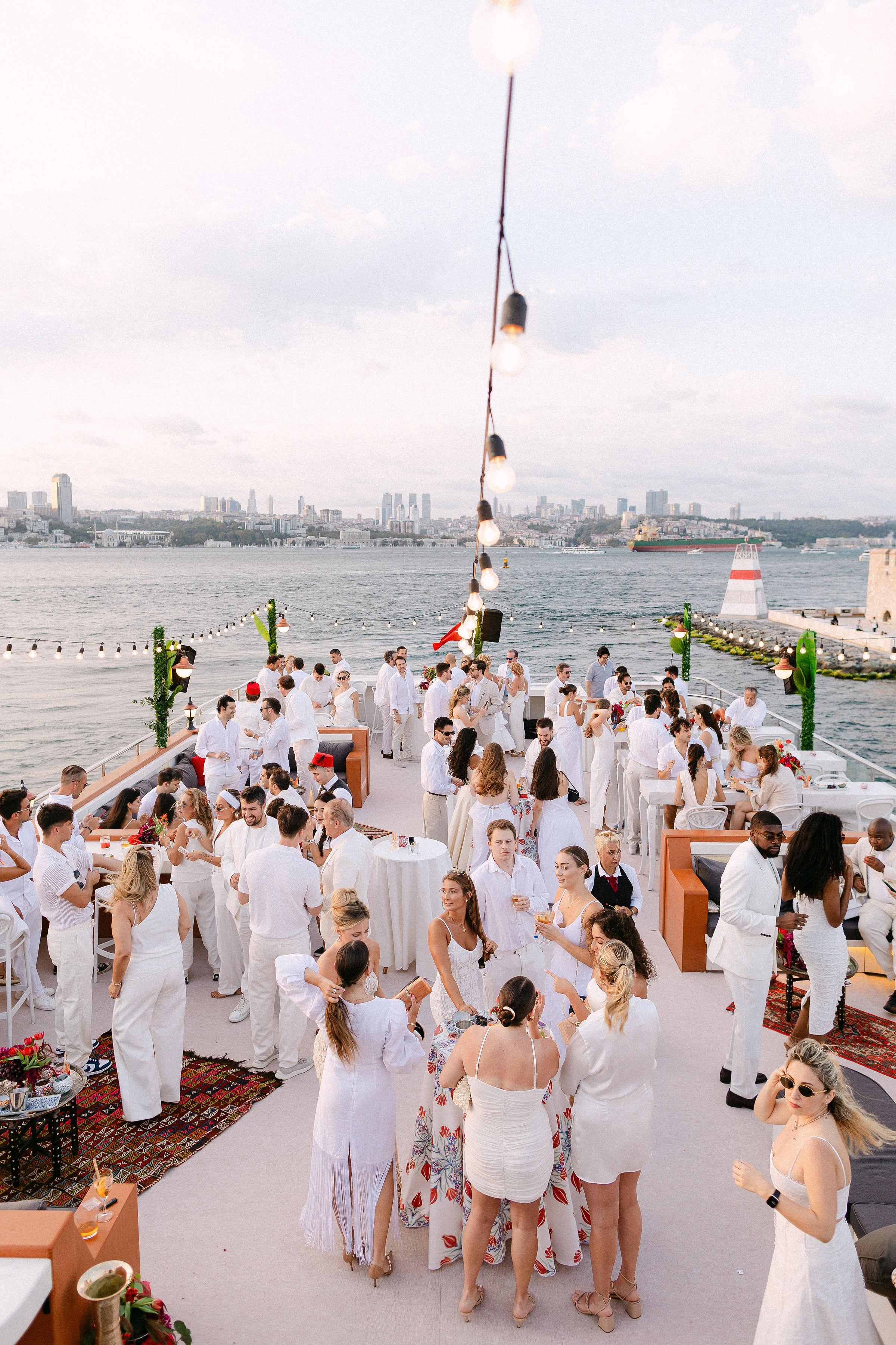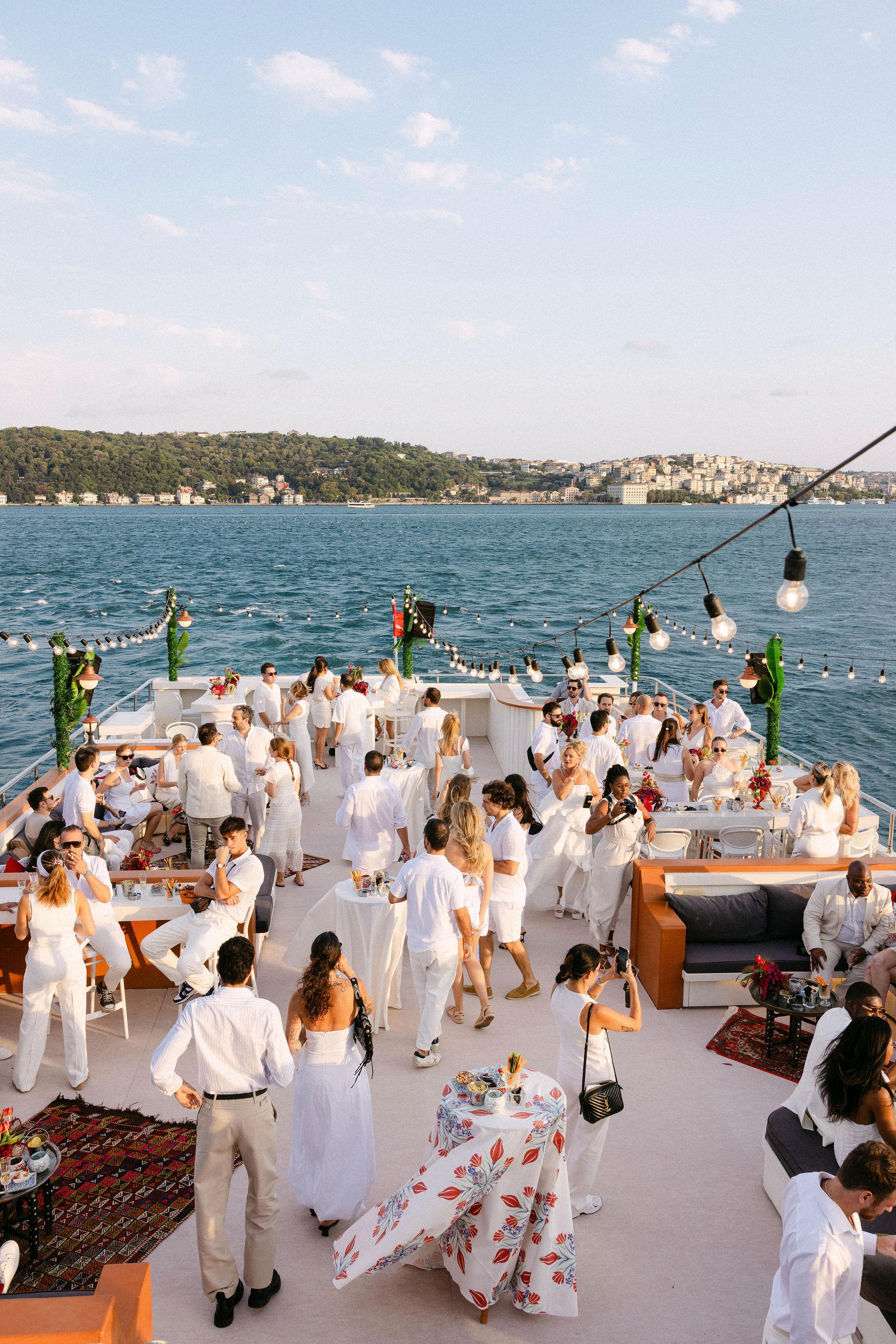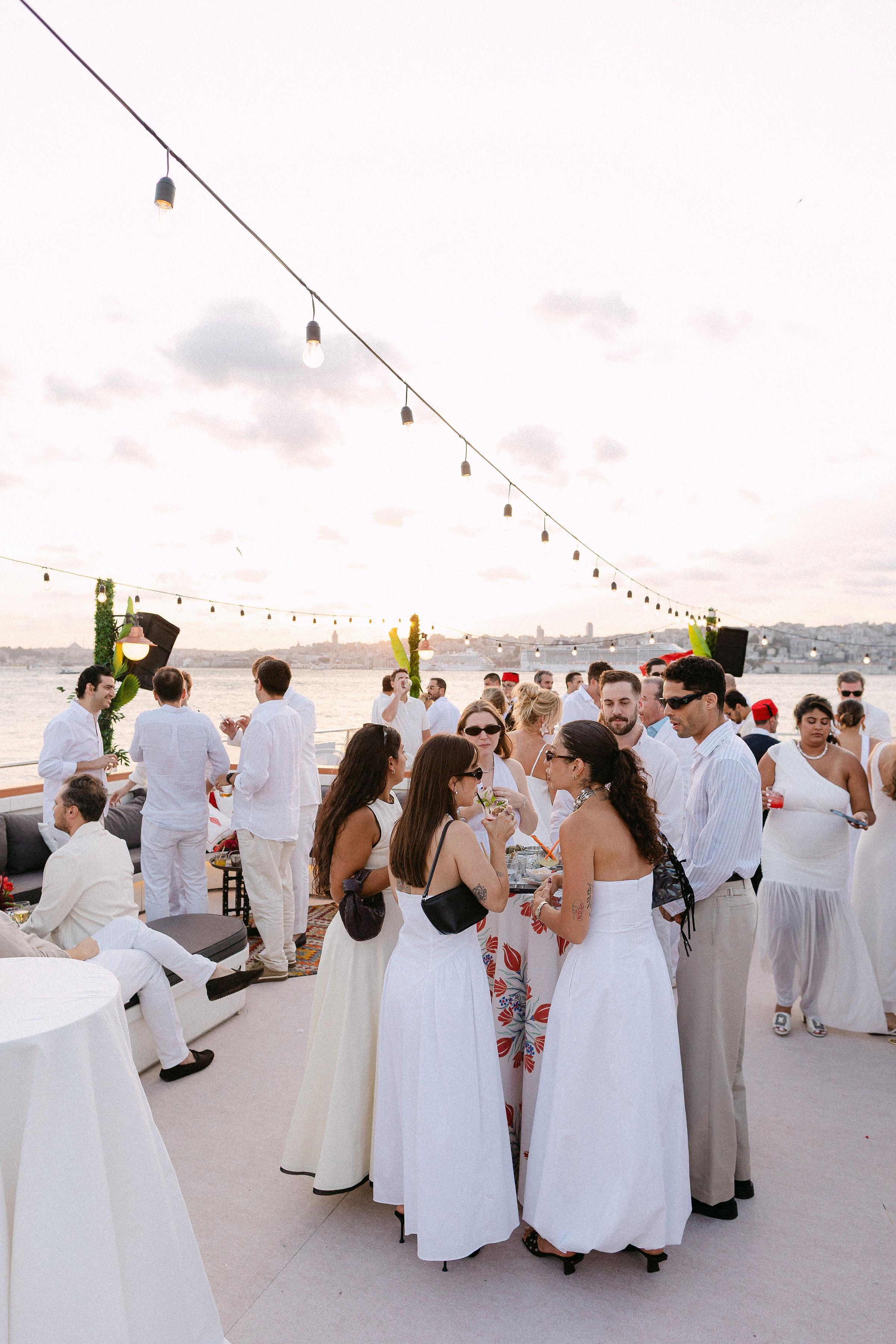 Düğün haftasının heyecanı, Çırağan Sarayı’ndan hareket eden özel bir tekne turuyla, İstanbul’un kalbinde başladı. Abbey ve Mete’nin yurt dışından gelen misafirleri için hazırladığımız bu "Welcome Party", geleneksel Türk misafirperverliğini modern lüks deneyimlerle birleştirdi ve düğün hafta sonuna misafirler harika bir etkinlikle başladılar. Teknenin zemininden dekorasyonun en küçük detayına kadar özenle uyguladığımız kırmızı beyaz konsepti, İstanbul Boğaz’ının lacivert sularıyla kusursuz bir kontrast oluşturdu. Tüm misafirlerin beyazlar içinde katıldığı gecede, sevgili Abbey, Cult Gaia tasarımı elbisesiyle İstanbul’un ışıkları altında adeta parladı. İmza kokteyller, teknede yankılanan müzikler ve İstanbul Boğaz’ının serin esintisi eşliğinde gerçekleşen bu gece; sadece bir kutlama değil, İstanbul’u bir destinasyon düğün rotası olarak seçen Abbey ve Mete ile misafirler için unutulmaz bir deneyime dönüştü.