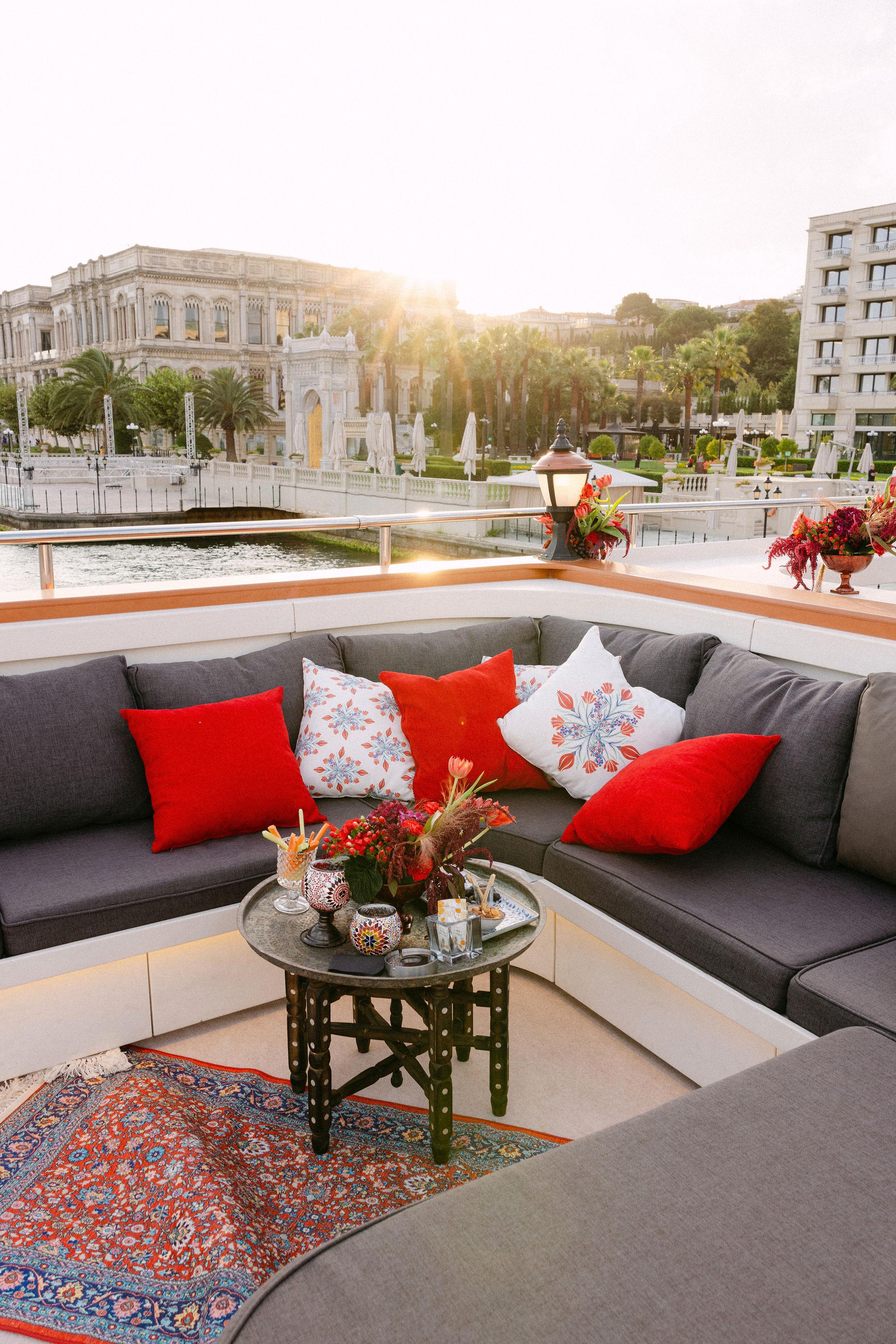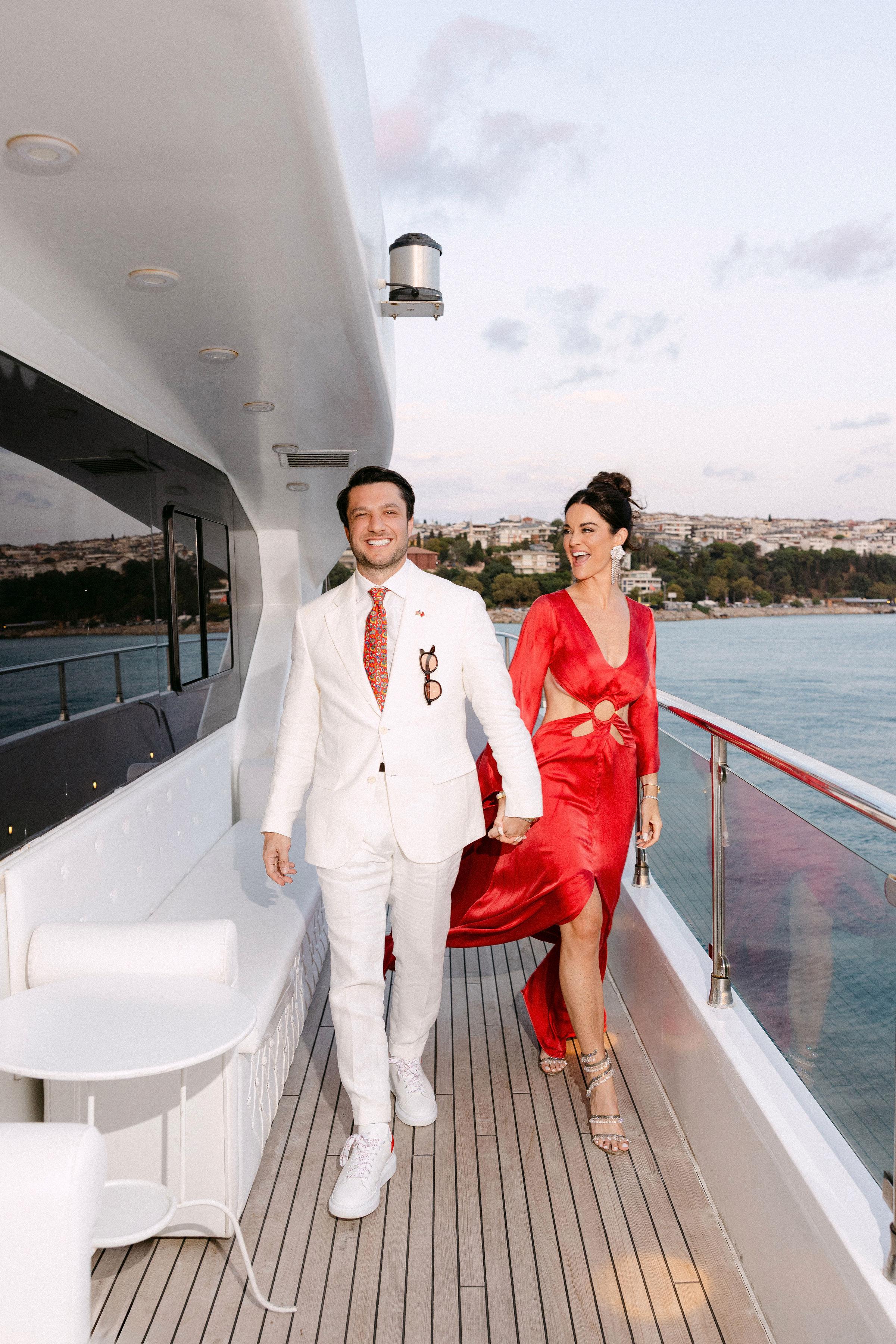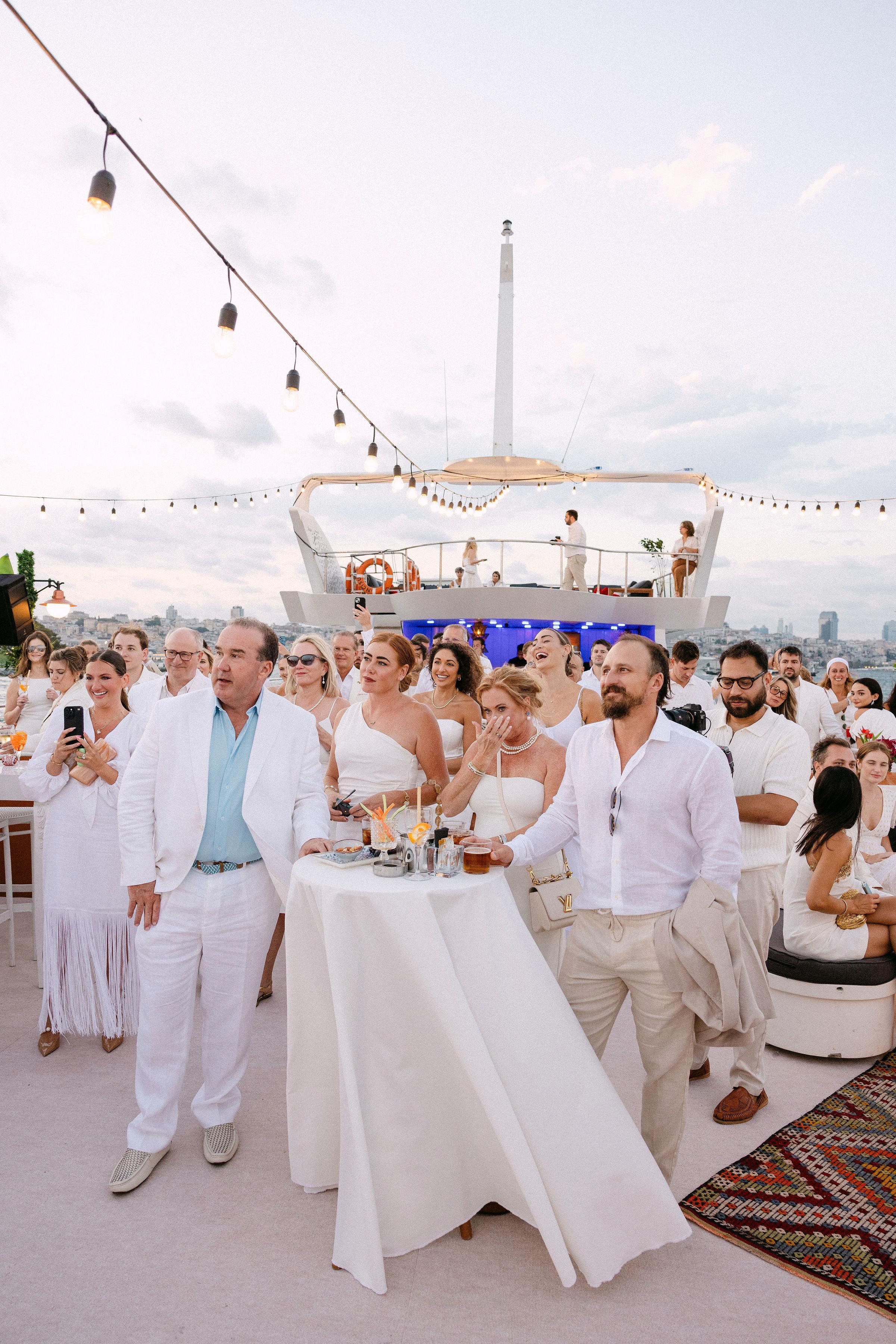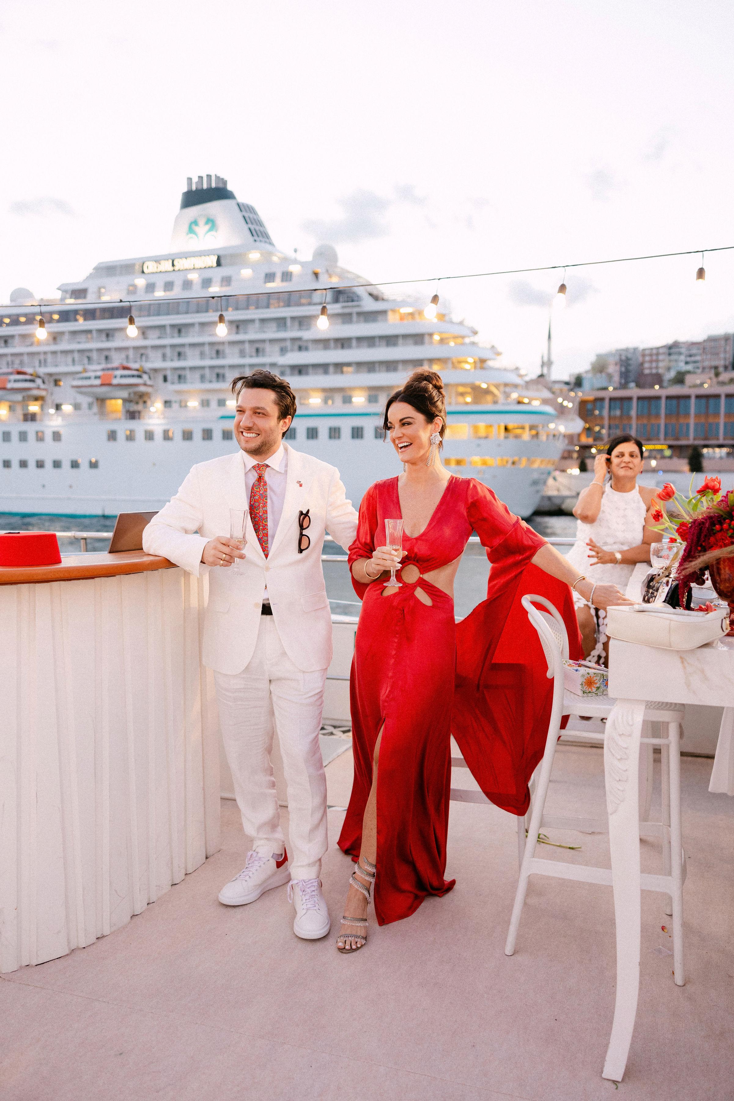 Düğün haftasının heyecanı, Çırağan Sarayı’ndan hareket eden özel bir tekne turuyla, İstanbul’un kalbinde başladı. Abbey ve Mete’nin yurt dışından gelen misafirleri için hazırladığımız bu "Welcome Party", geleneksel Türk misafirperverliğini modern lüks deneyimlerle birleştirdi ve düğün hafta sonuna misafirler harika bir etkinlikle başladılar. Teknenin zemininden dekorasyonun en küçük detayına kadar özenle uyguladığımız kırmızı beyaz konsepti, İstanbul Boğaz’ının lacivert sularıyla kusursuz bir kontrast oluşturdu. Tüm misafirlerin beyazlar içinde katıldığı gecede, sevgili Abbey, Cult Gaia tasarımı elbisesiyle İstanbul’un ışıkları altında adeta parladı. İmza kokteyller, teknede yankılanan müzikler ve İstanbul Boğaz’ının serin esintisi eşliğinde gerçekleşen bu gece; sadece bir kutlama değil, İstanbul’u bir destinasyon düğün rotası olarak seçen Abbey ve Mete ile misafirler için unutulmaz bir deneyime dönüştü.