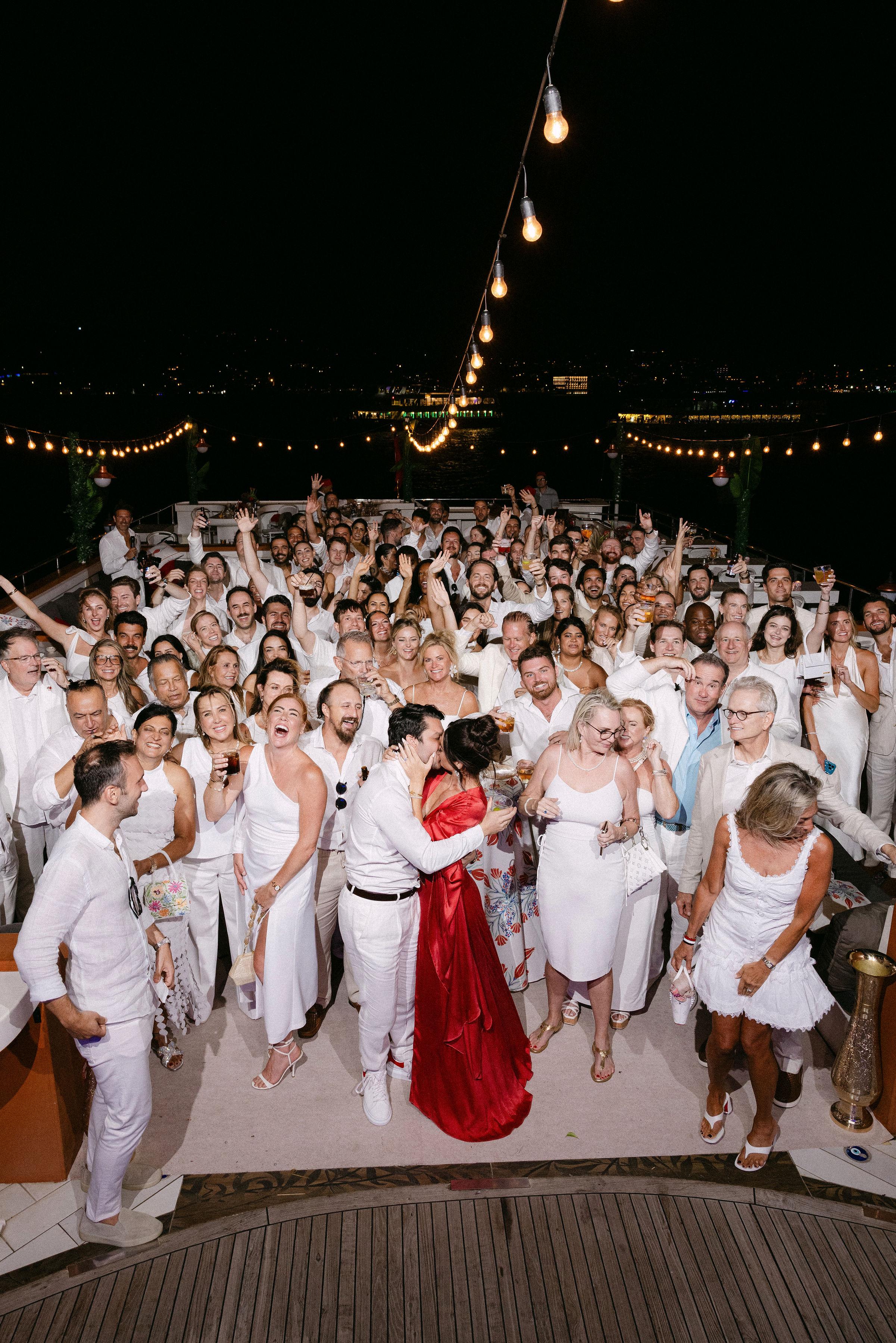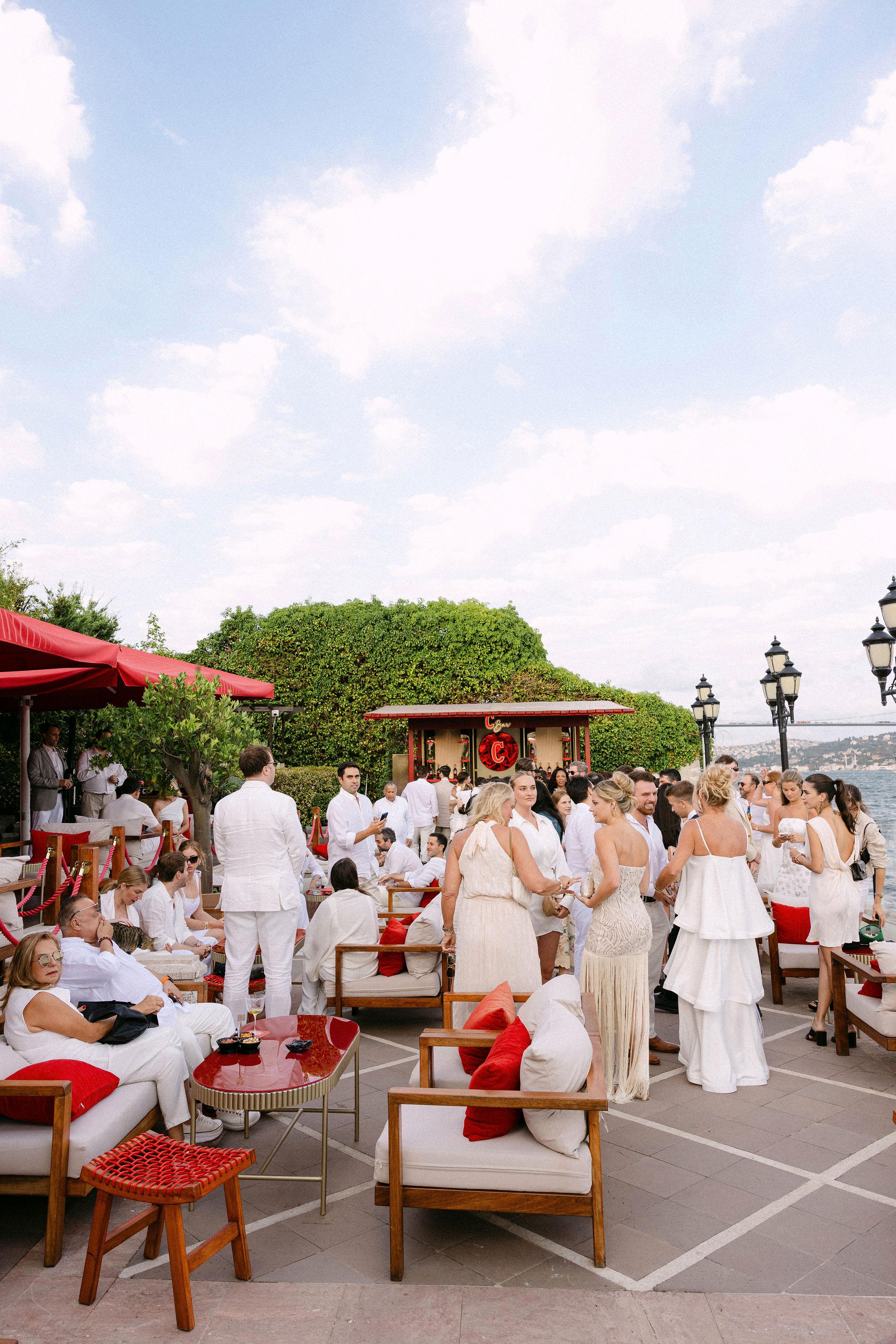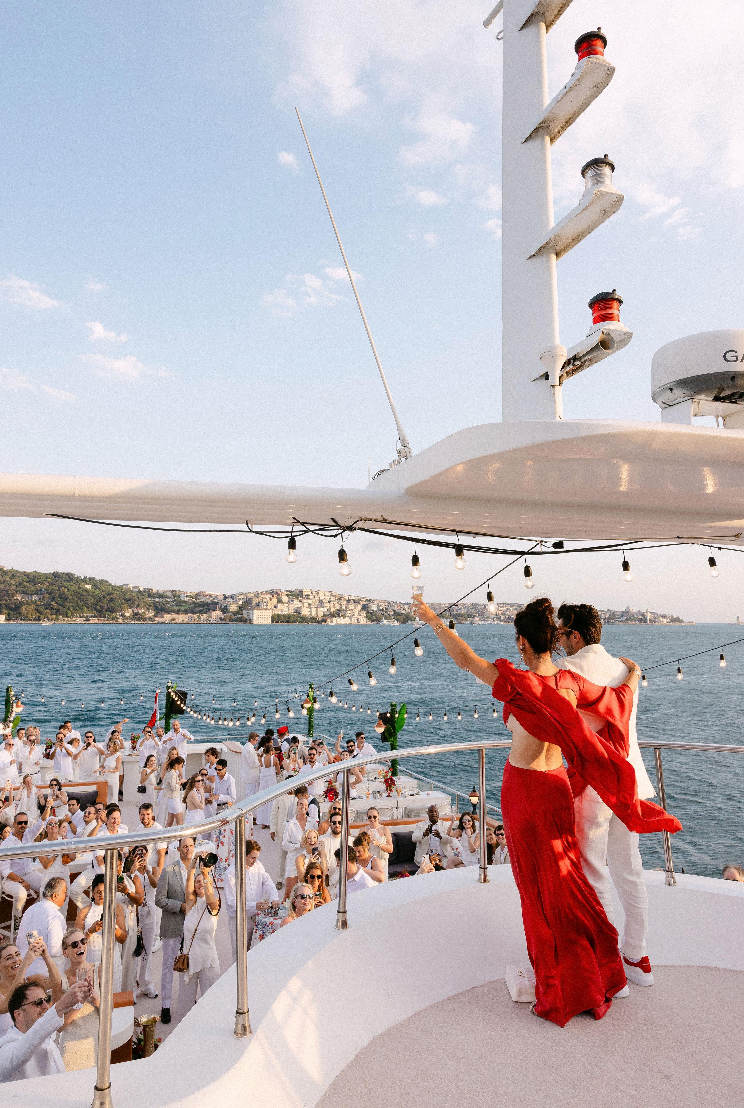 Düğün haftasının heyecanı, Çırağan Sarayı’ndan hareket eden özel bir tekne turuyla, İstanbul’un kalbinde başladı. Abbey ve Mete’nin yurt dışından gelen misafirleri için hazırladığımız bu "Welcome Party", geleneksel Türk misafirperverliğini modern lüks deneyimlerle birleştirdi ve düğün hafta sonuna misafirler harika bir etkinlikle başladılar. Teknenin zemininden dekorasyonun en küçük detayına kadar özenle uyguladığımız kırmızı beyaz konsepti, İstanbul Boğaz’ının lacivert sularıyla kusursuz bir kontrast oluşturdu. Tüm misafirlerin beyazlar içinde katıldığı gecede, sevgili Abbey, Cult Gaia tasarımı elbisesiyle İstanbul’un ışıkları altında adeta parladı. İmza kokteyller, teknede yankılanan müzikler ve İstanbul Boğaz’ının serin esintisi eşliğinde gerçekleşen bu gece; sadece bir kutlama değil, İstanbul’u bir destinasyon düğün rotası olarak seçen Abbey ve Mete ile misafirler için unutulmaz bir deneyime dönüştü.
